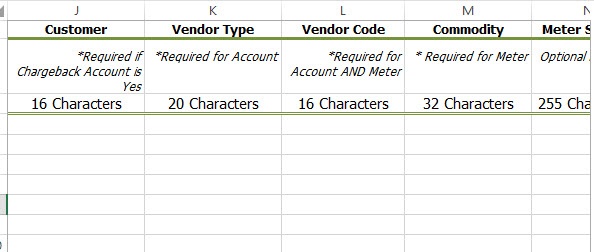 - Use drop-downs whenever possible to complete your setup. So if you are filling out the Accounts & Meters setup sheet, and you’ve already filled out the Vendor setup sheet, then it’s a snap to select the correct commodity associated with a meter related to the account, because that information is already in the “system” and in the spreadsheet dropdowns. Using the drop-downs consistently will help ensure reliability and consistency in your data.